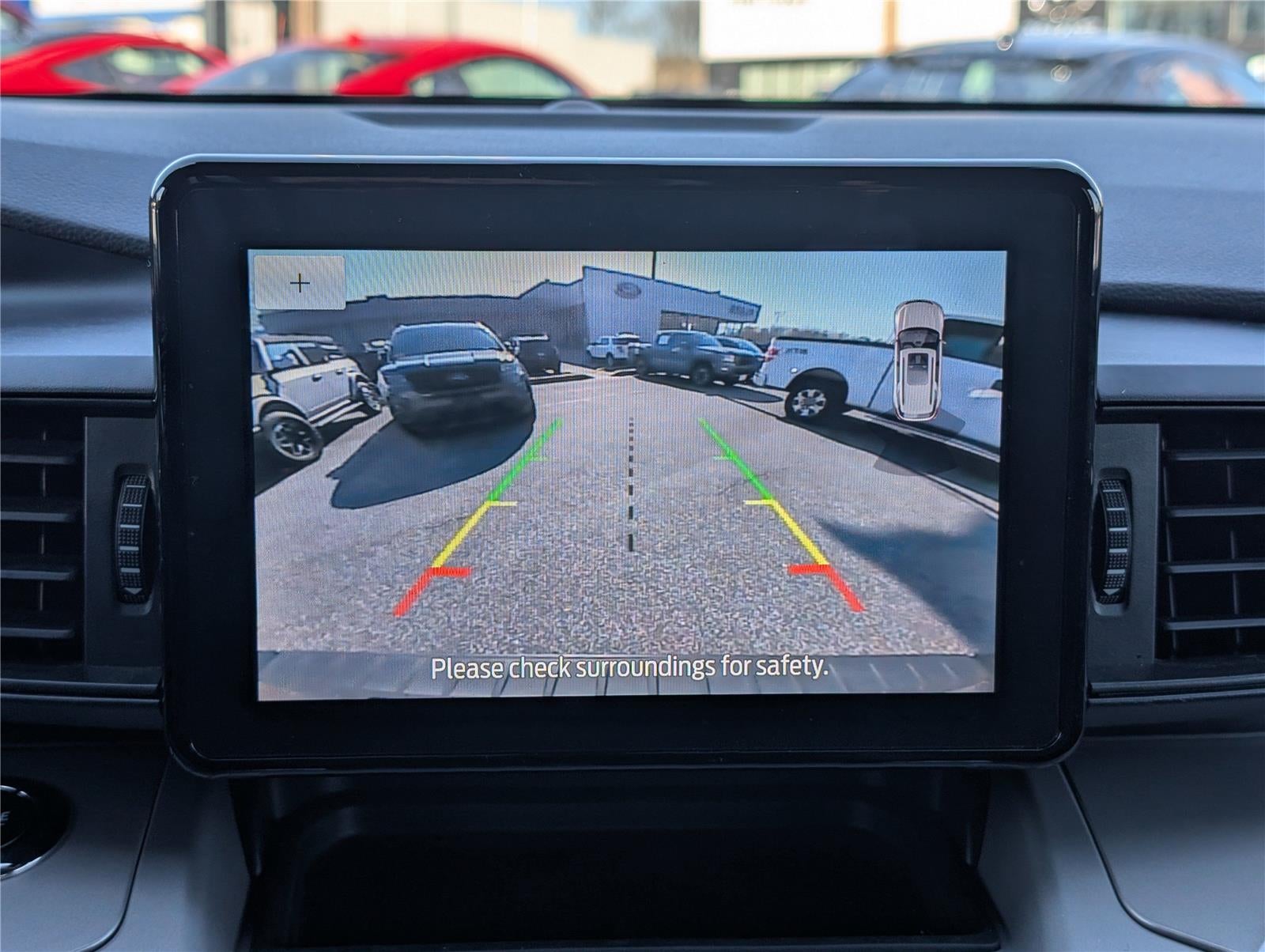 - The vehicle is equipped with a camera that displays an image of the area behind the vehicle on an interior display. The camera is equipped with its own washer.
